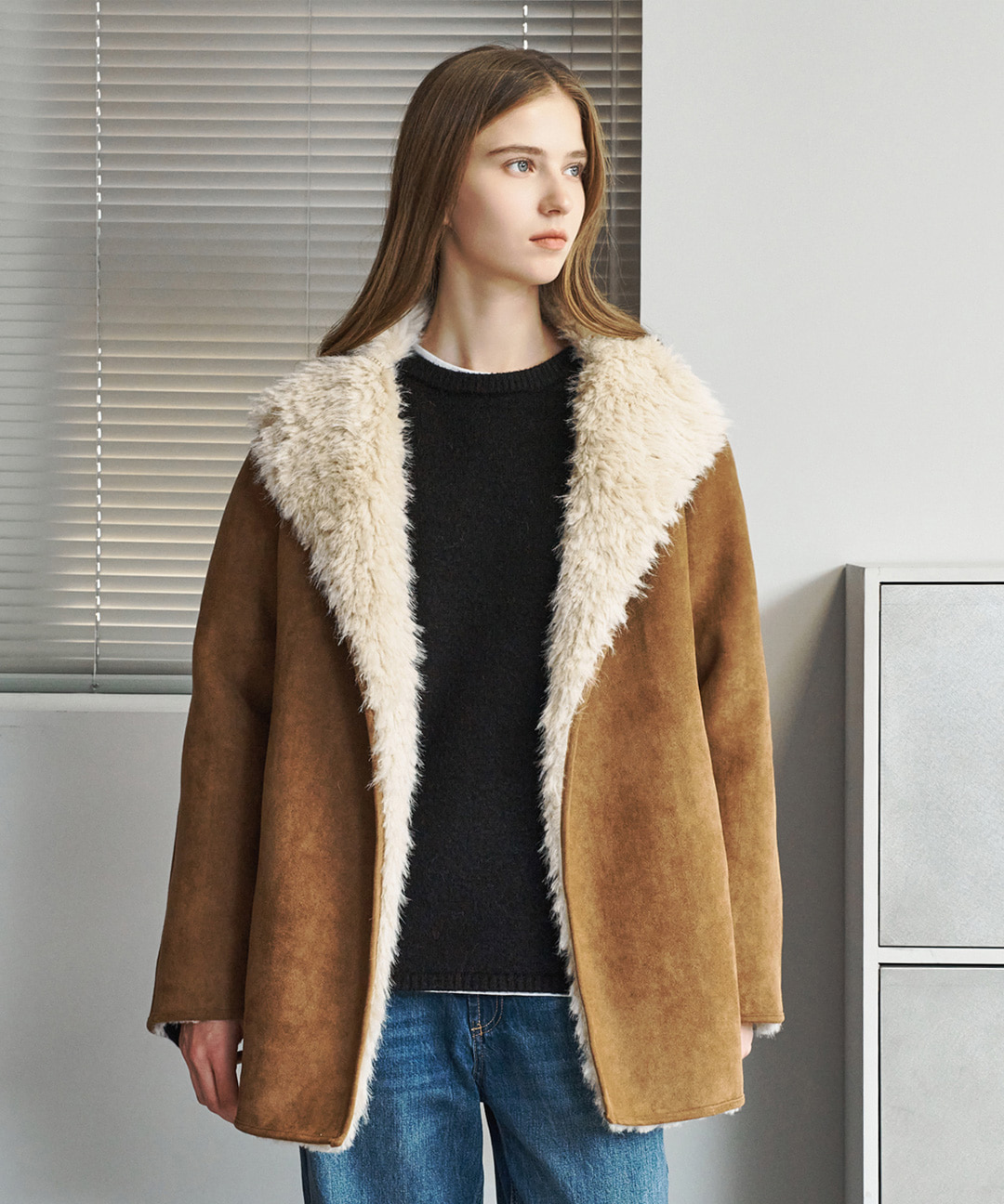 소프트 시어링 퍼 하프 넥버튼 무스탕 자켓 (NP4JK014L0)