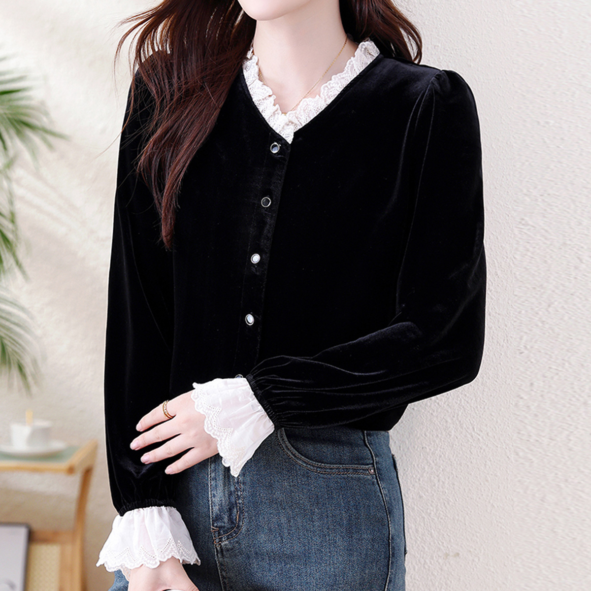 클라셰 레이스벨벳코디블라우스_B5W0425