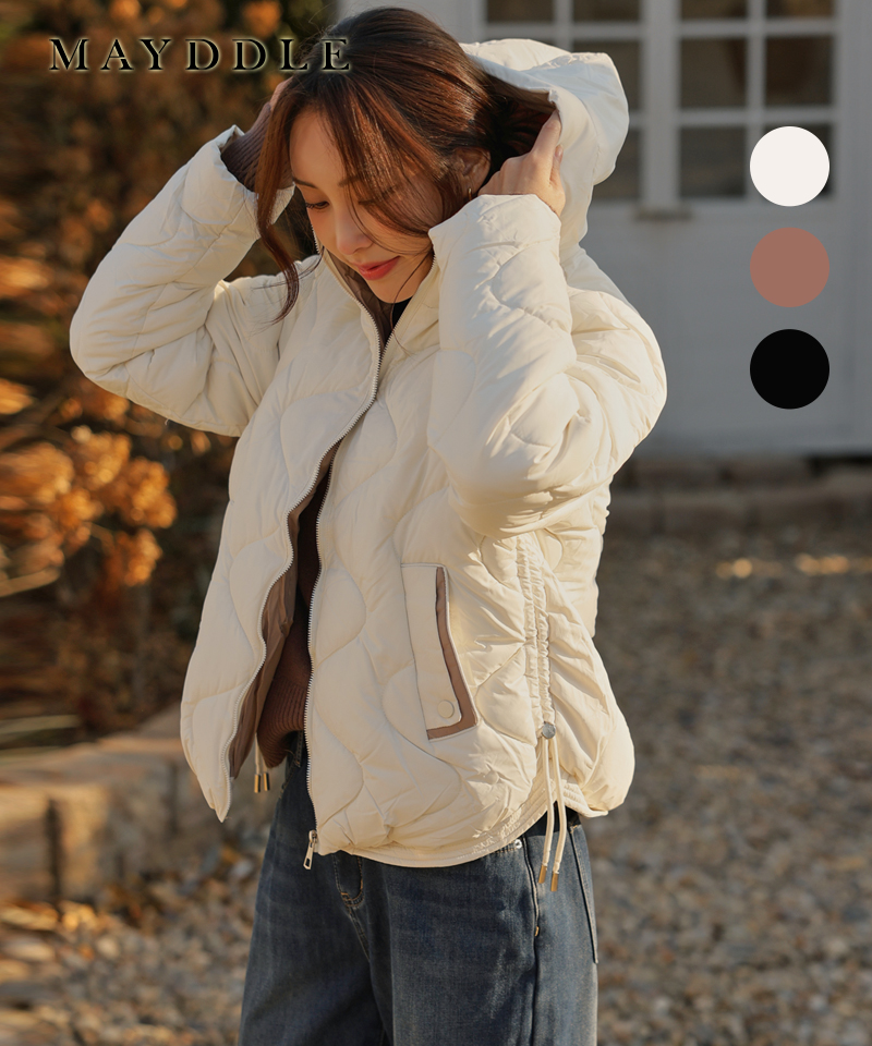 [영상핏]컬러배색 스트링 후드패딩 / 블랙 브라운 아이보리 집업점퍼 하프점퍼 한파 보온 허리스트링 꾸안꾸 캐주얼 딸선물 선물추천 데일리룩 겨울아우터 솜패딩 후디점퍼