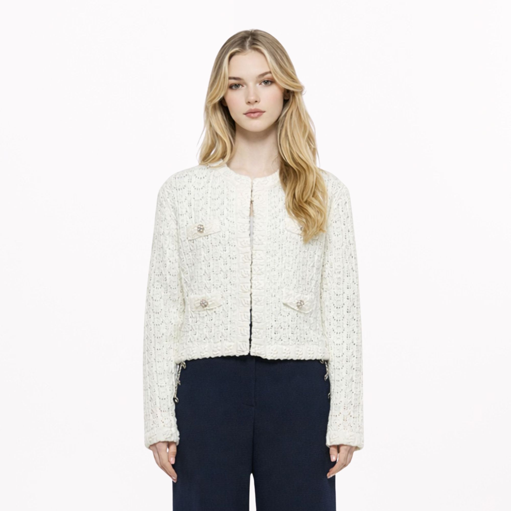 26SS 플라워 버튼 크로쉐 니트 자켓_BG11NKCD7310_IV