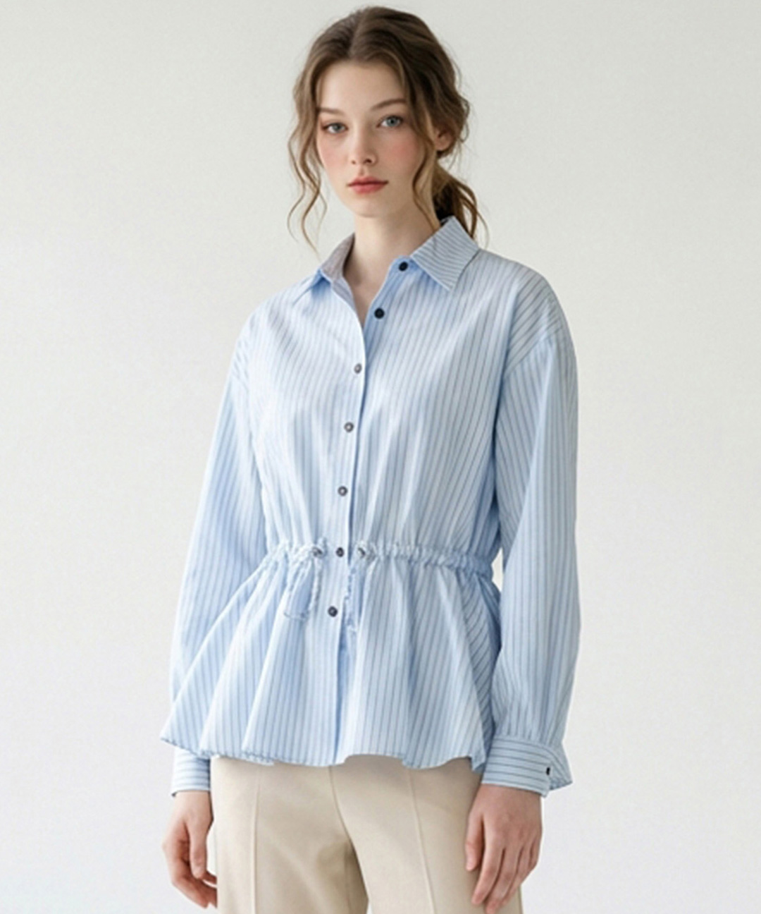 [포커스] 페플럼 스트링 스트라이프 블라우스_VF6S1BL5031