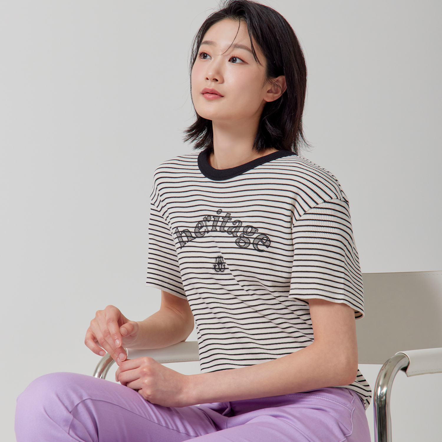 (2컬러) 스트라이프 자수 포인트 뒷리본 장식 반팔 티셔츠 LCTSP329
