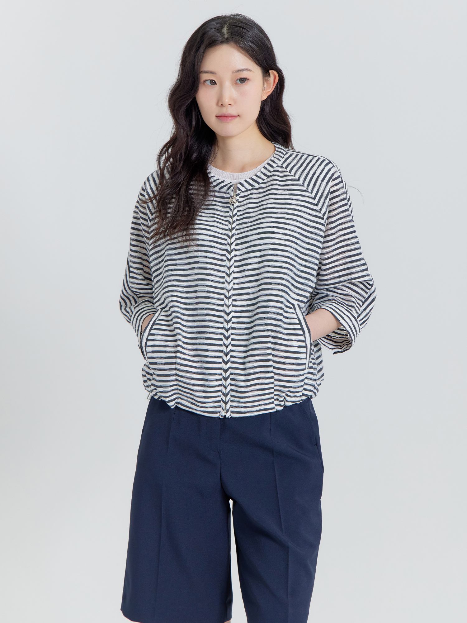 [봄시즌오프] 스트라이프 라운드넥 7부 집업 자켓 LFWSP492_BK