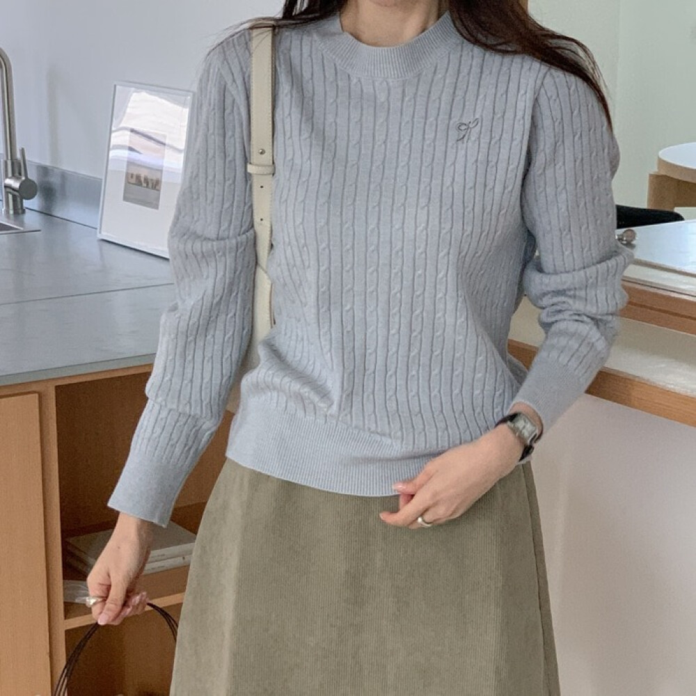 [플러리싱] 리본 자수 잔꽈배기 라운드넥 니트 [플러리싱]