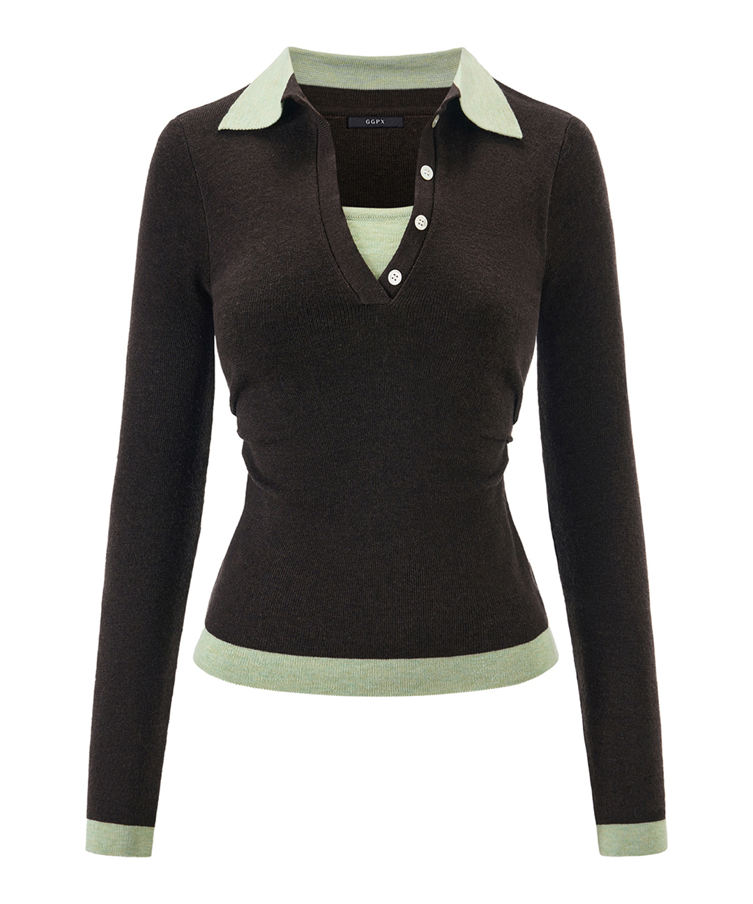 레이어드 반버튼업 카라 사이드 배색 셔링 니트 (GQAKT003D)