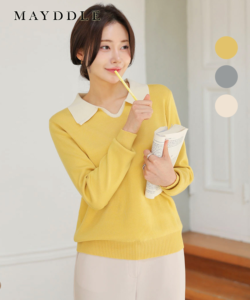모나배색 카라니트 / 카라넥니트 카라브이넥니트 옐로우 아이보니 네이비 봄스웨터 출근룩 직장인룩 예쁜니트 단정한니트 꾸안꾸상의 여성긴팔니트 봄신상 노랑니트티 긴소매니트 밝은니트