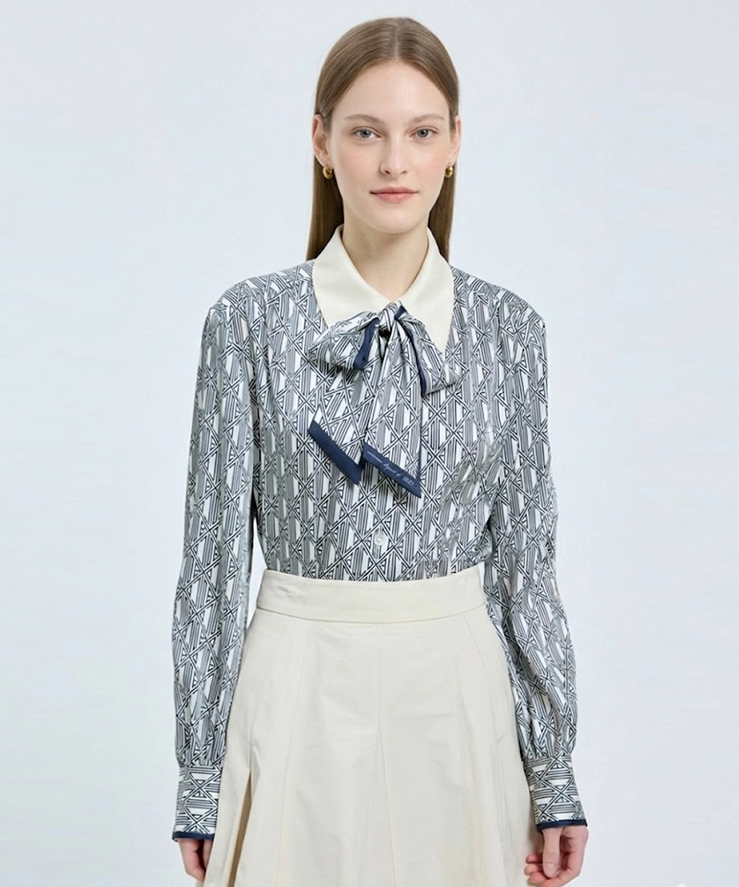 [데코] (본사직영) 기하학 프린트 리본 블라우스-DCBAD1105W