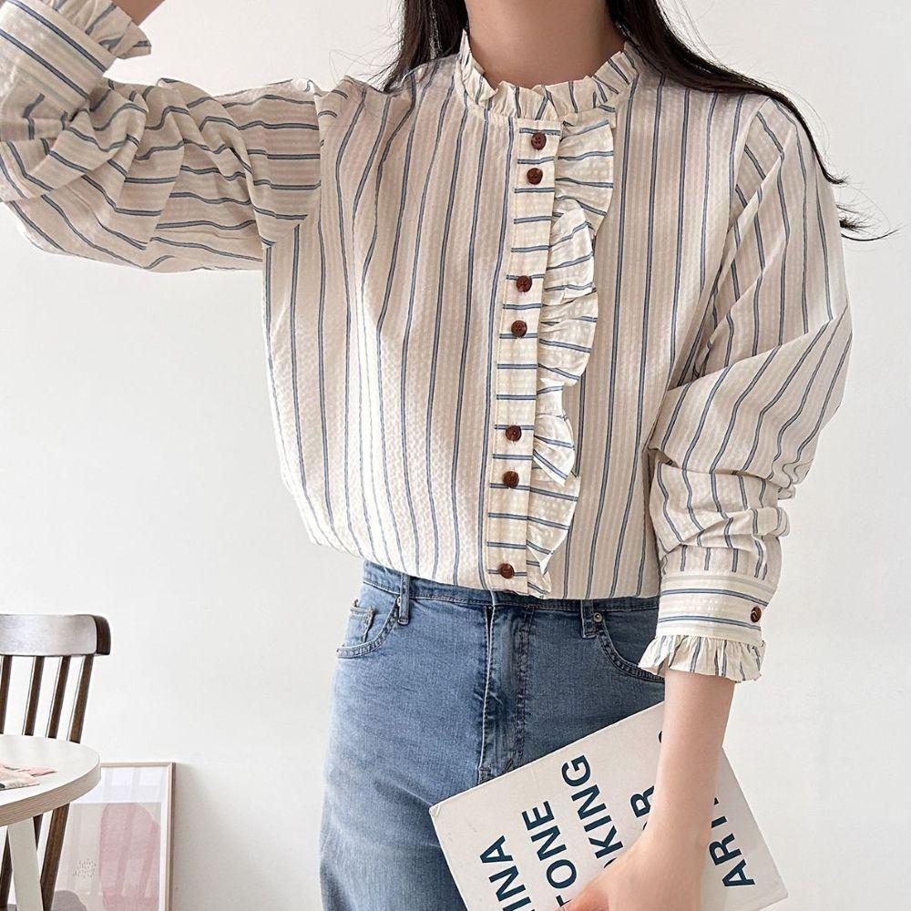 면100 나나 프릴넥블라우스 국산 여성 단가라 노카라블라우스 셔링 하객룩 직장인 캐주얼
