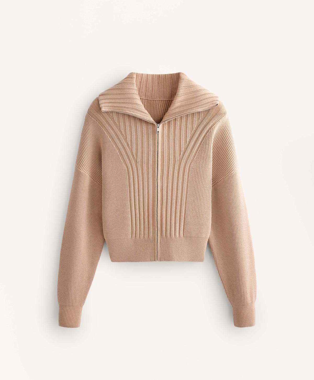 오이쇼 베이지 하이넥 립 니트 집업 재킷 4830/695/781 PRALINE