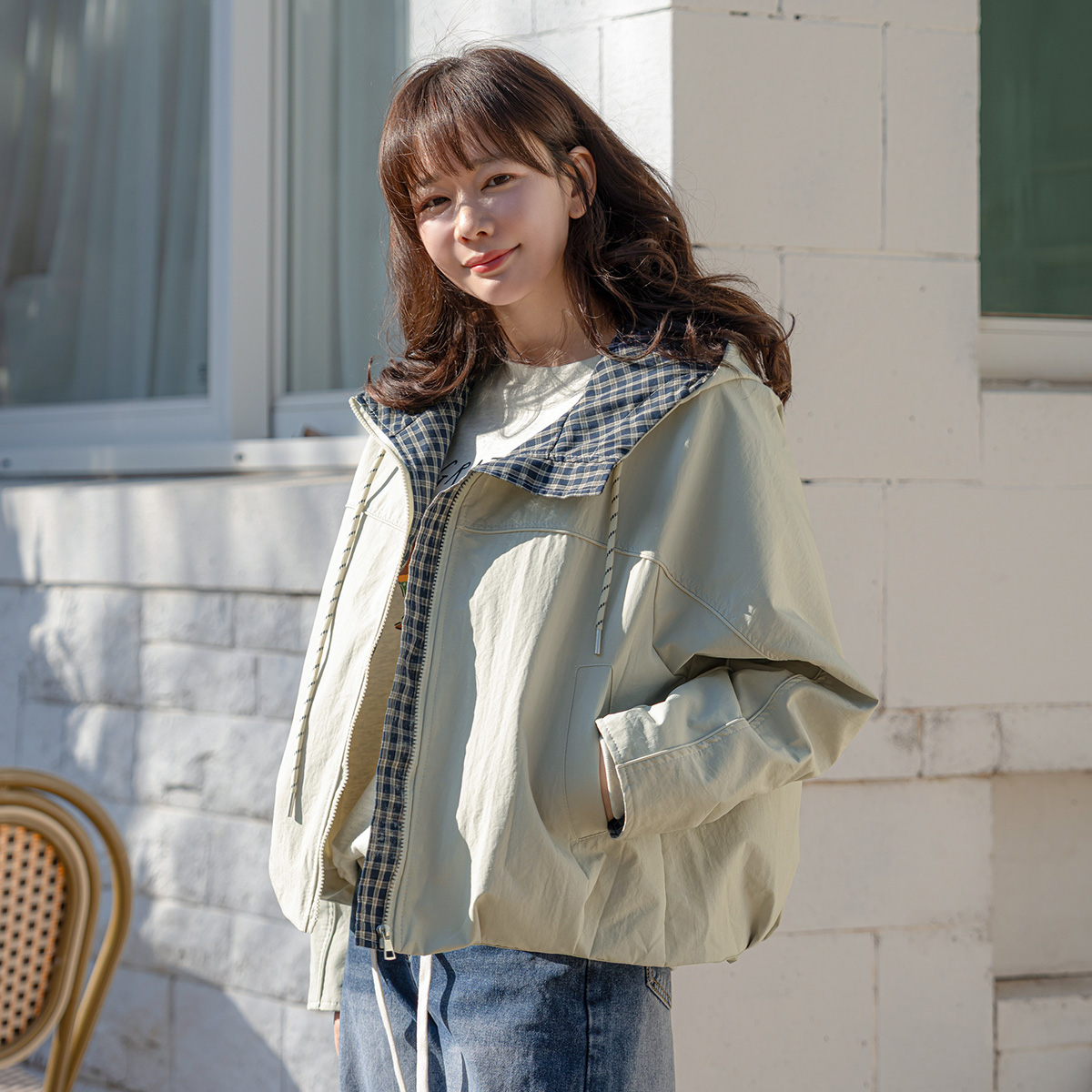 [키첼] 델마 체크 배색 후드 집업 자켓