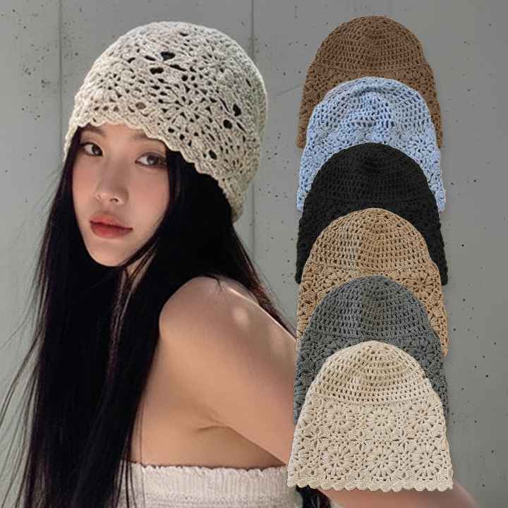여성 내추럴 플라워 뜨개 니트 크로셰 비니모자