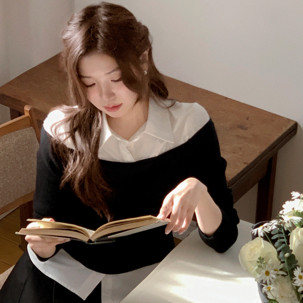 [프롬리리컬] (레이어드한듯/출근룩/하객룩) 헤이덴 레이어드 배색 오프숄더 니트 카라 셔츠 bs8618