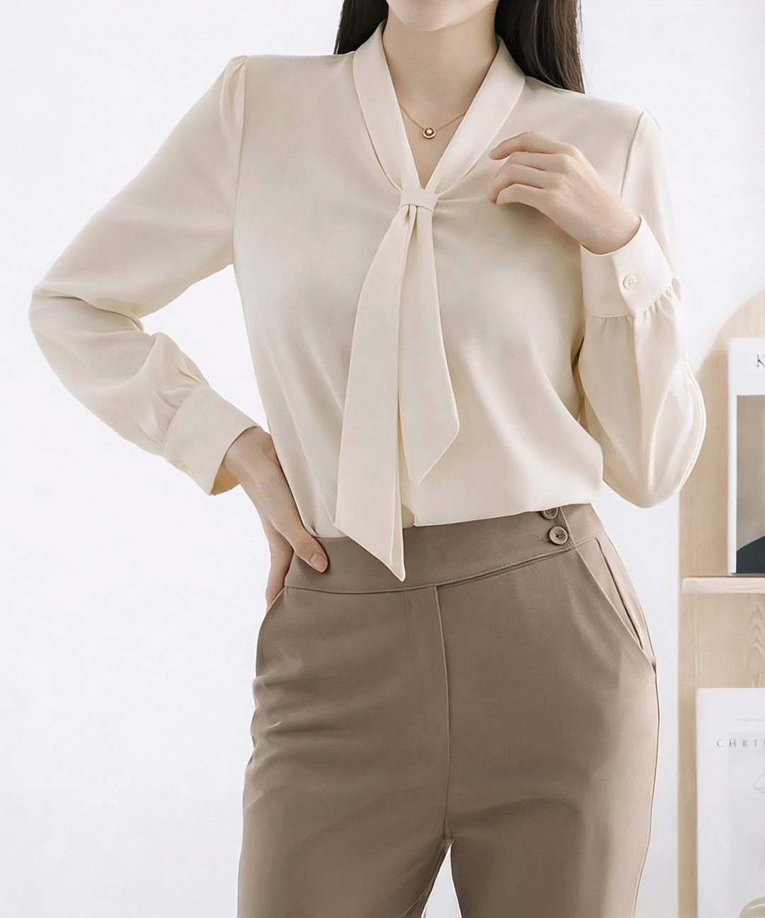 [모리스커밍홈] 타이 V넥 긴팔 블라우스_M2602BL018A