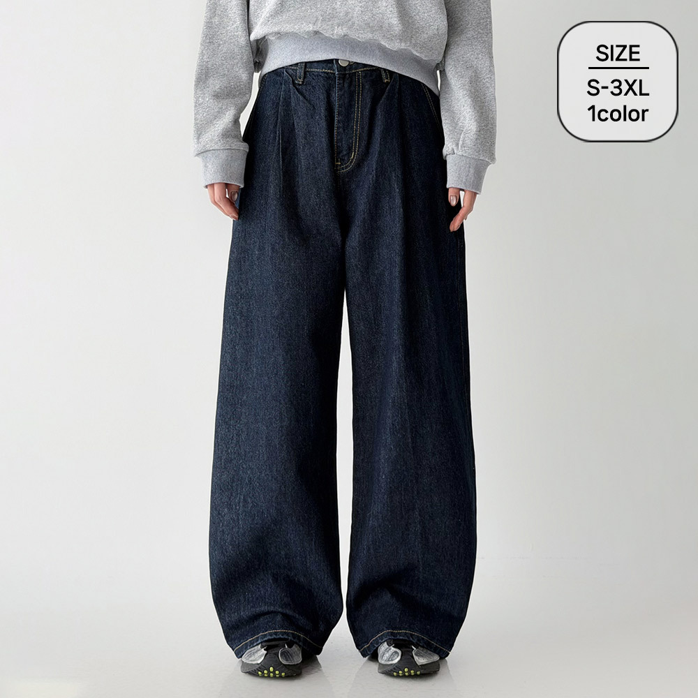(S~3XL) 다크블루 벌룬핏 핀턱 와이드 데님 팬츠