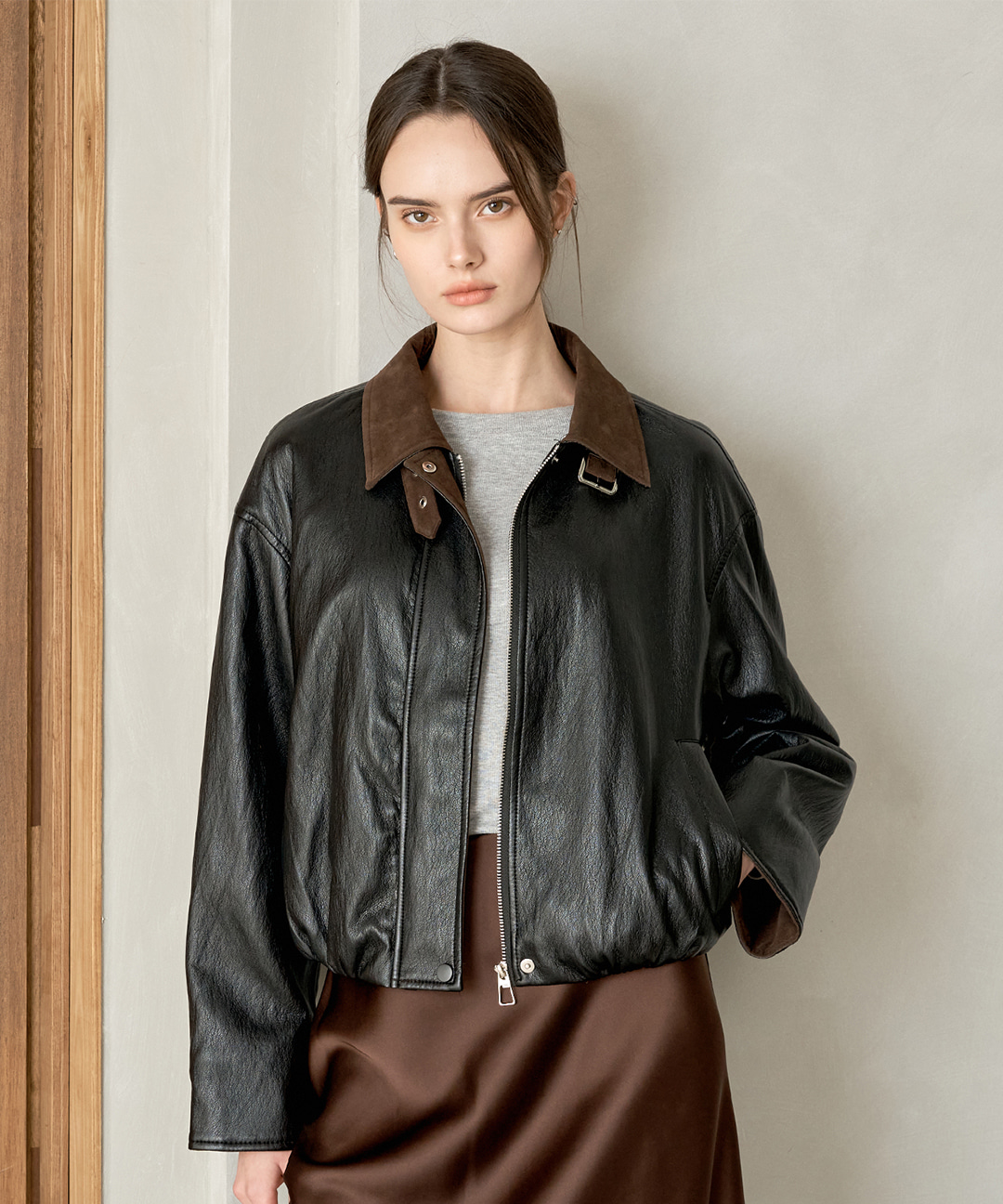 배색 카라 버클 밴딩 레더 자켓 (TY1JK009L0)