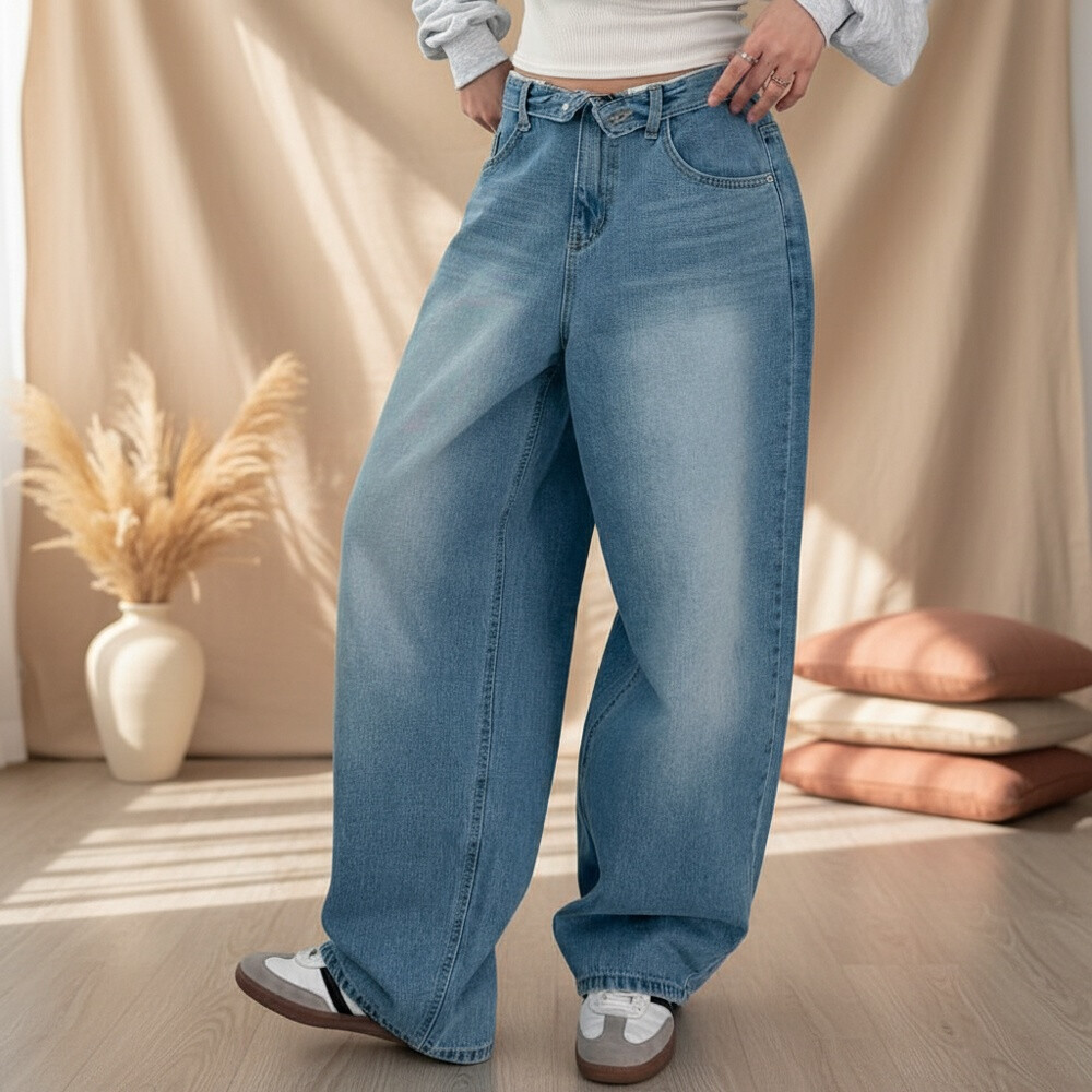 [옷자락] 여성 롤업 연청 와이드핏 맥시 청바지