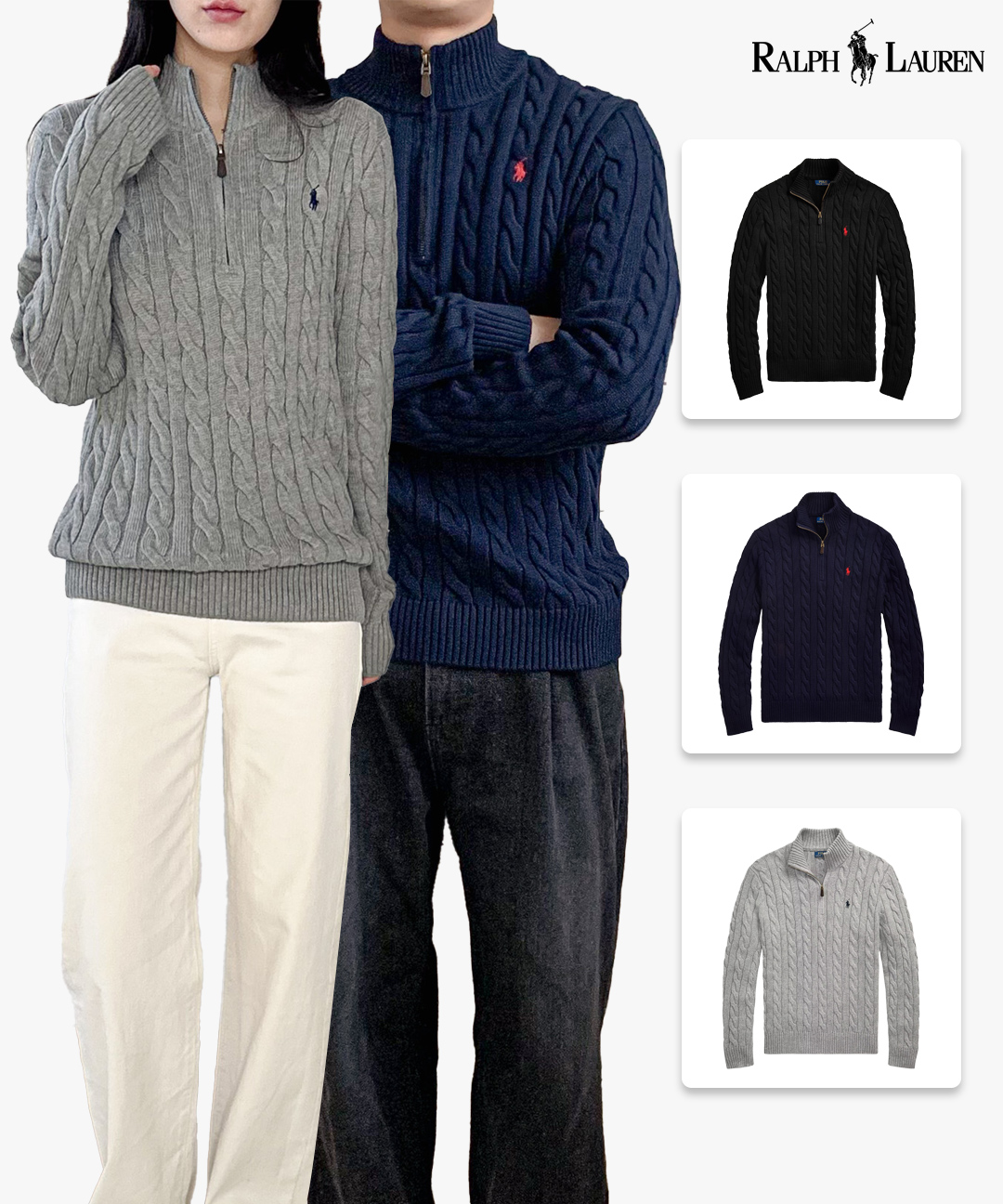 [폴로 랄프로렌] 여성 남성 포니 로고 꽈배기 반집업 니트 (색상 3종 택1)