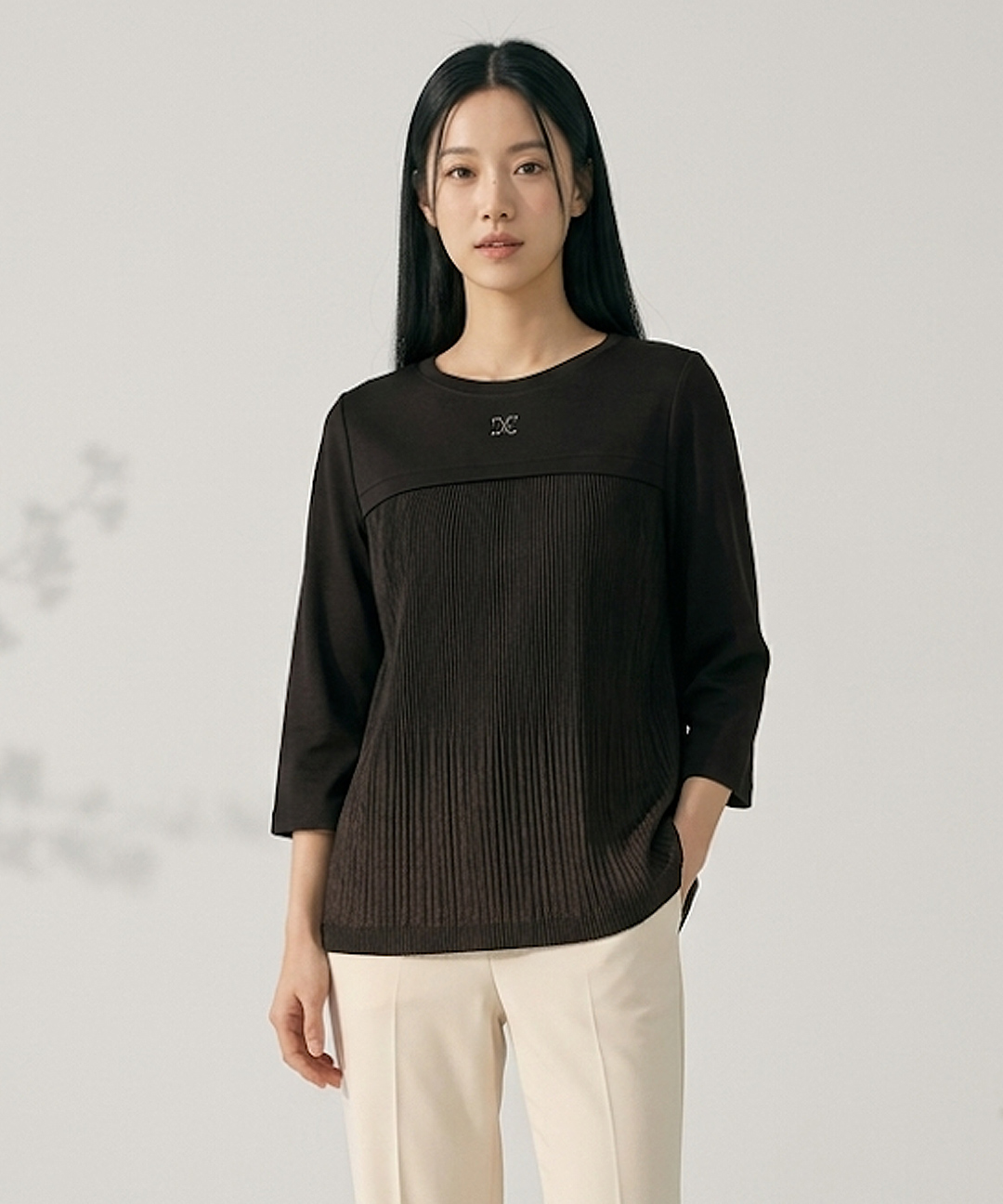 크로커다일레이디 배색절개 플리츠 7부 블라우스_CLEMTS502
