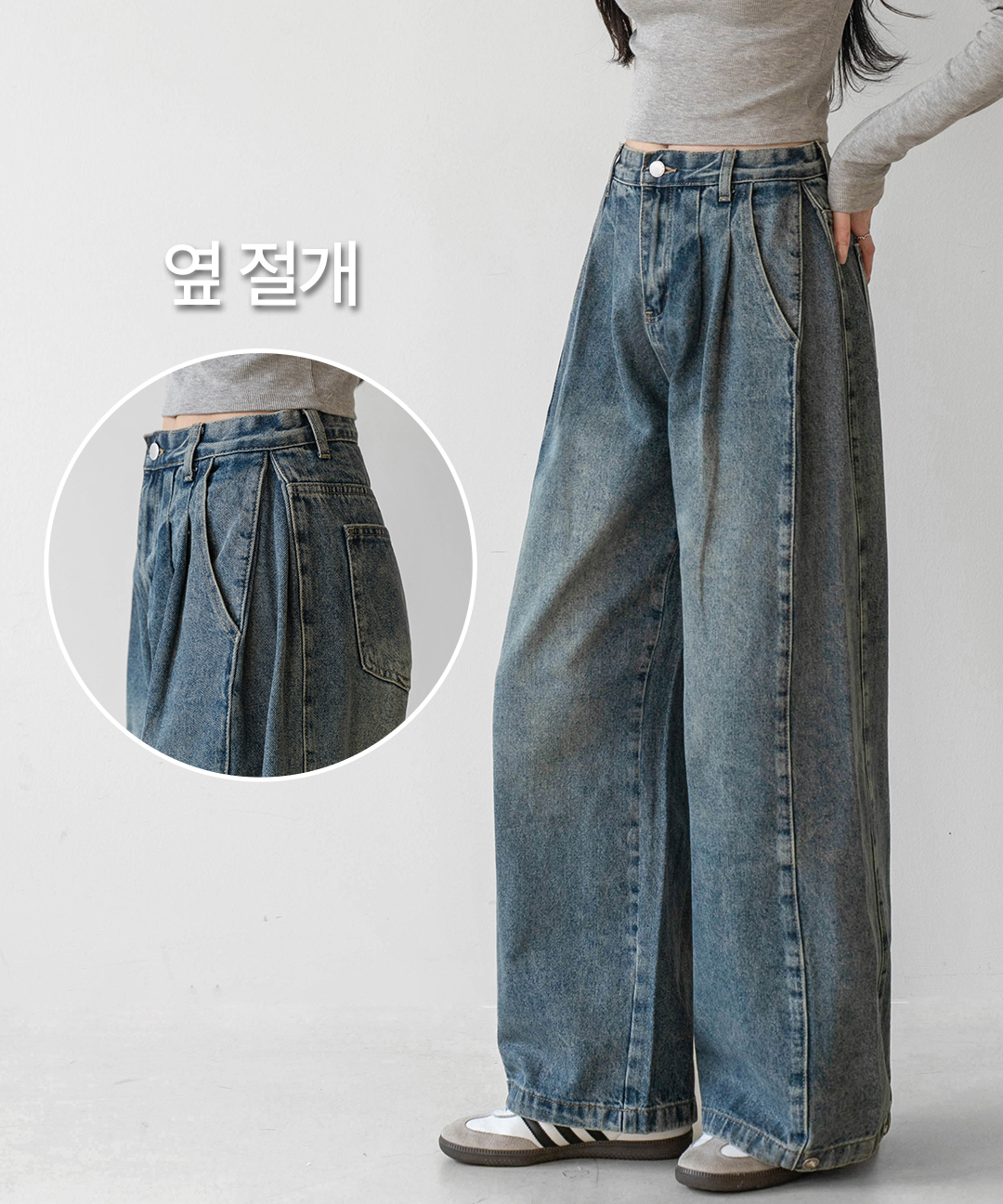 [진에비뉴] 투핀턱 밑단 스냅 와이드 데님 팬츠