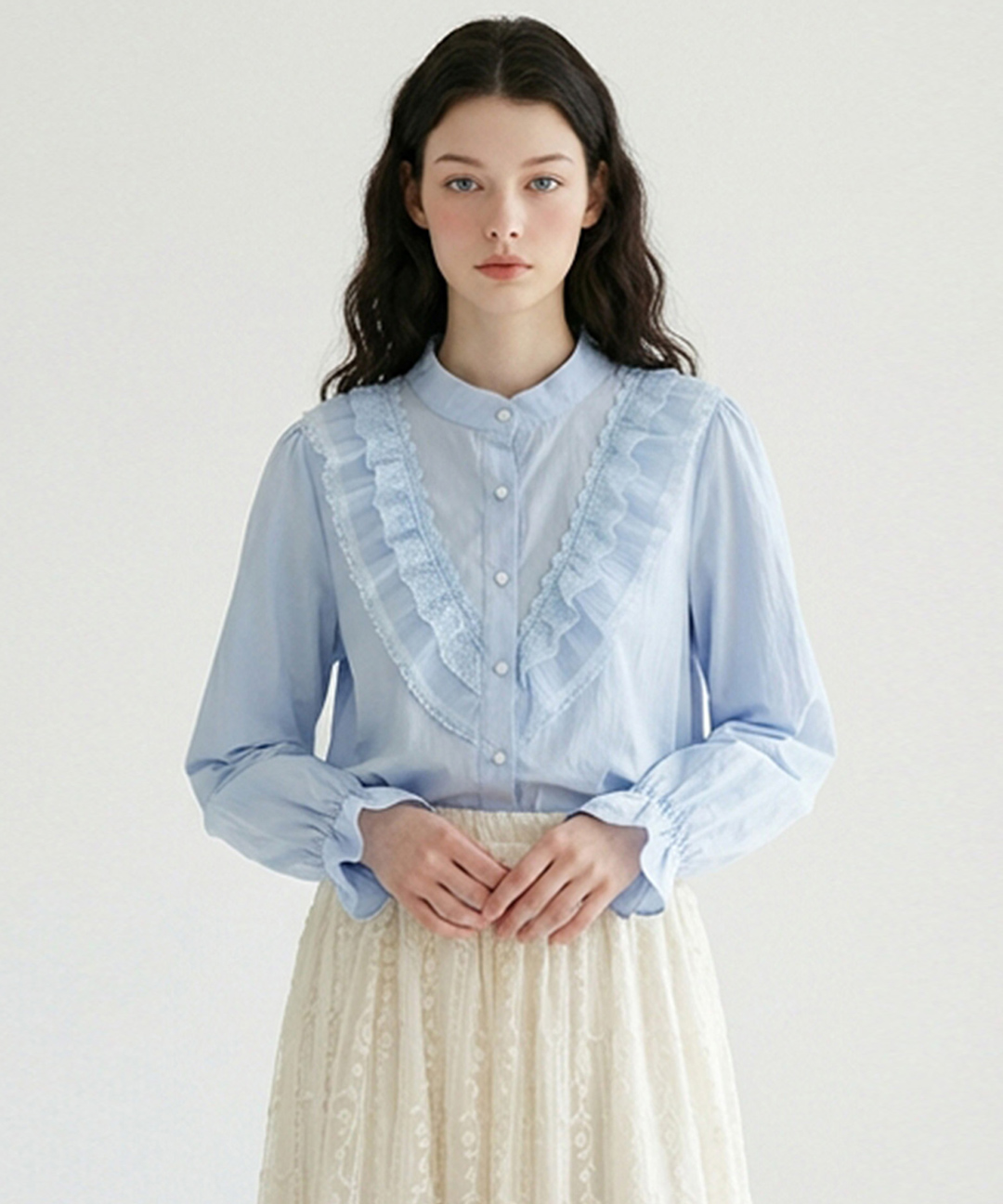 [포커스] 레이스 프릴 헨리넥 블라우스_VF6S1BL5201