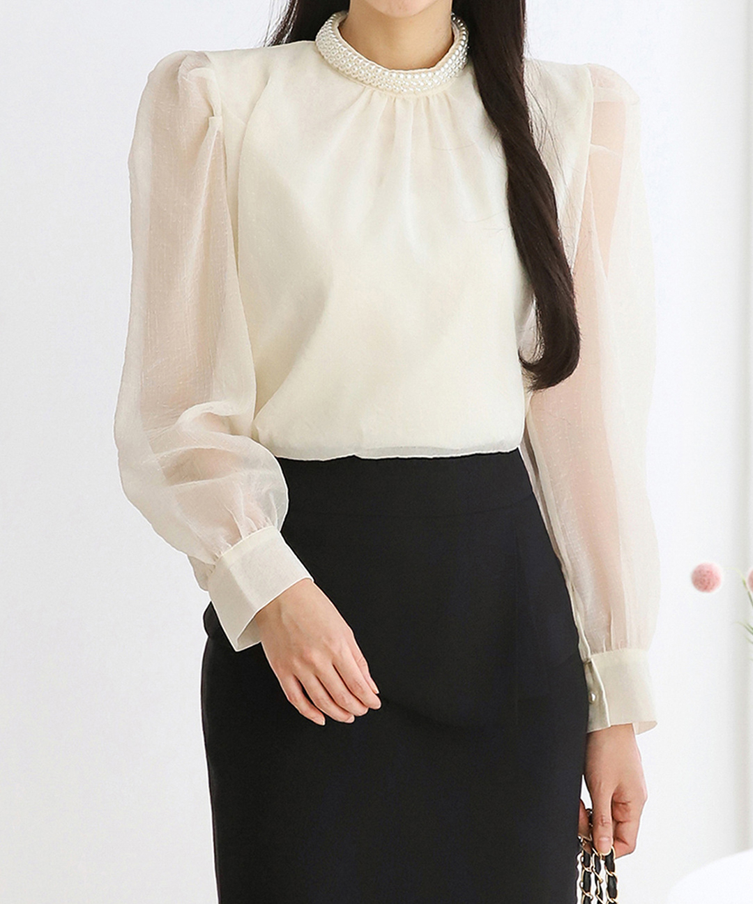 [모리스커밍홈] 진주넥 시스루 블라우스_M2602BL053A