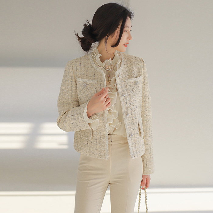 [스타일온미] 벤디스 톤온톤 라인 배색 골드 펄 트위드 자켓