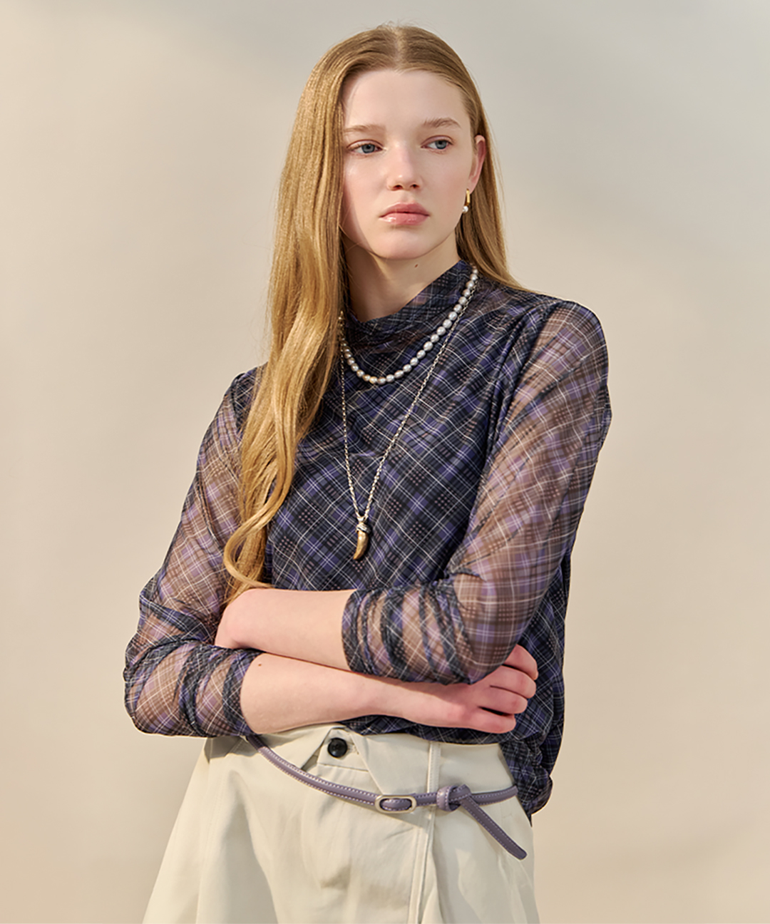 [마쟈] 글렌 체크 시어 모크넥 티셔츠