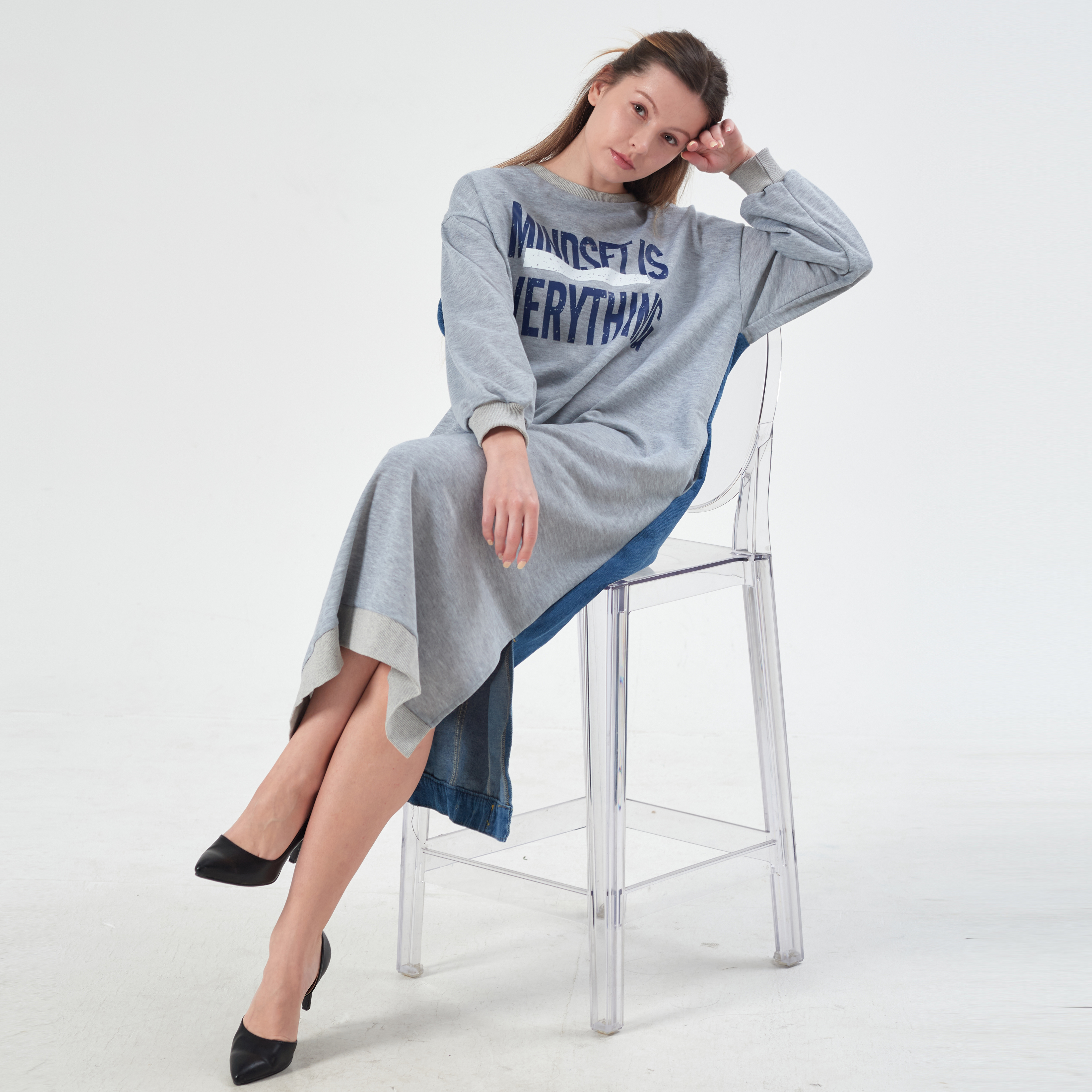 [3color] 여성 오버핏 맨투맨 데님 롱원피스