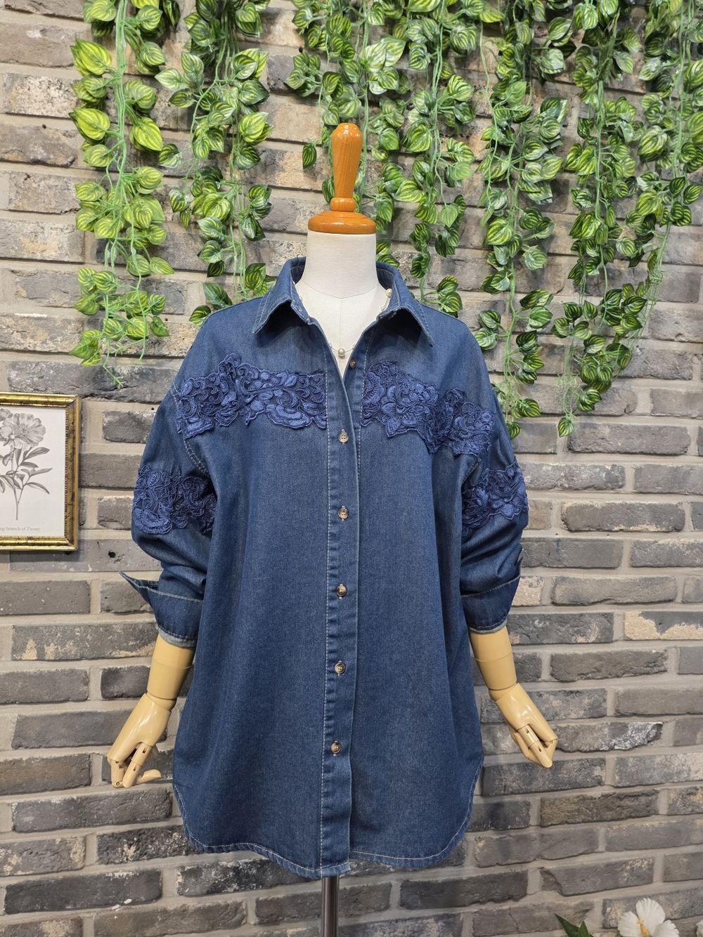 플라워 자수 레이스 하프 롱 데님 청남방