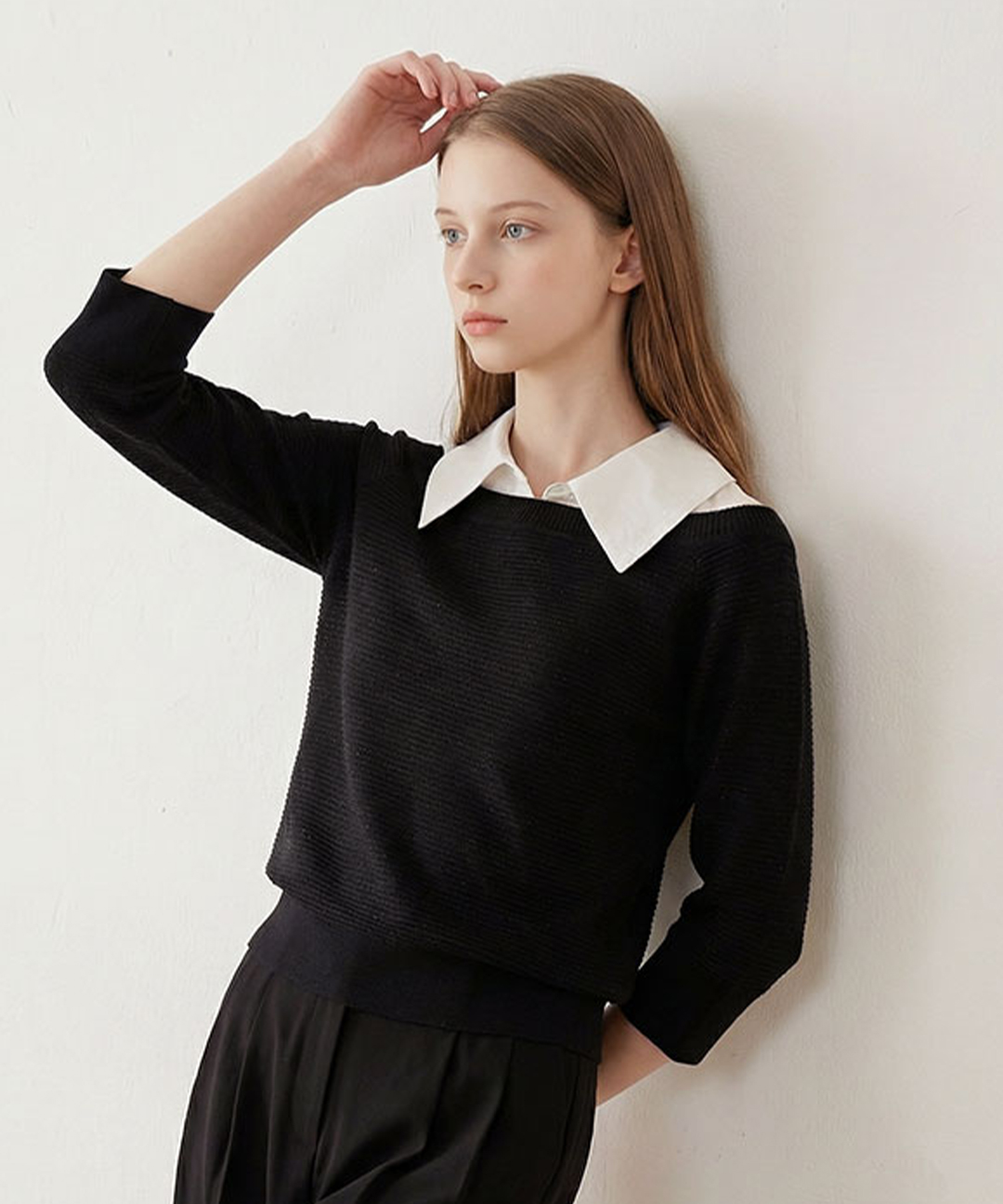 [로코엘라] 커스틴 레이어드 배색 셔츠 카라 니트