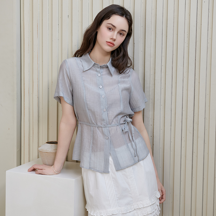 [26 신상] 끈 카라넥 반팔 텐셀 블라우스 (VMBAE2449)