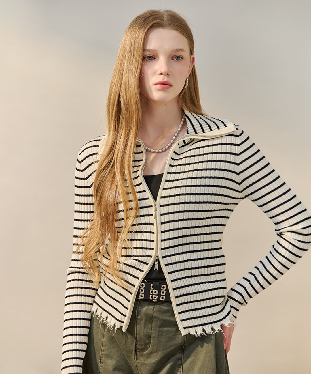 [마쟈] 빈티지 데미지 스트라이프 하이넥 니트 집업