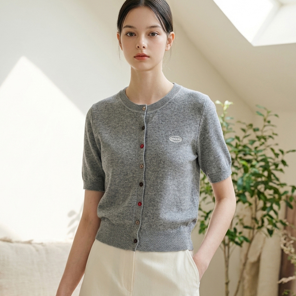 여성 컬러 단추 반팔 라운드 가디건