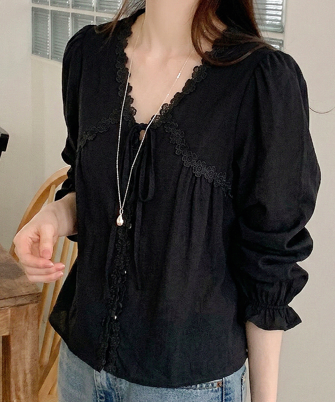브이넥 플라워 셔링 긴팔 블라우스 (WIDABL001)