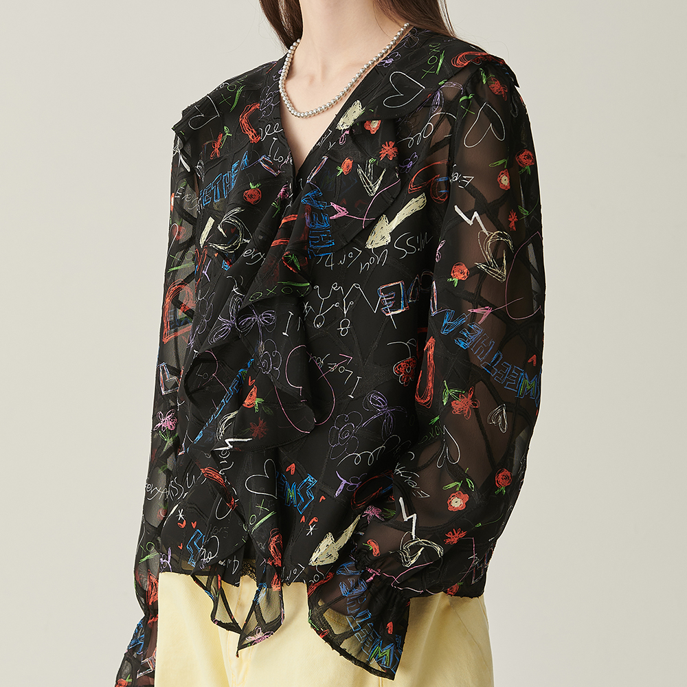 [마이르핀] 컬러풀 유니크 프린트 러플 시스루 블라우스