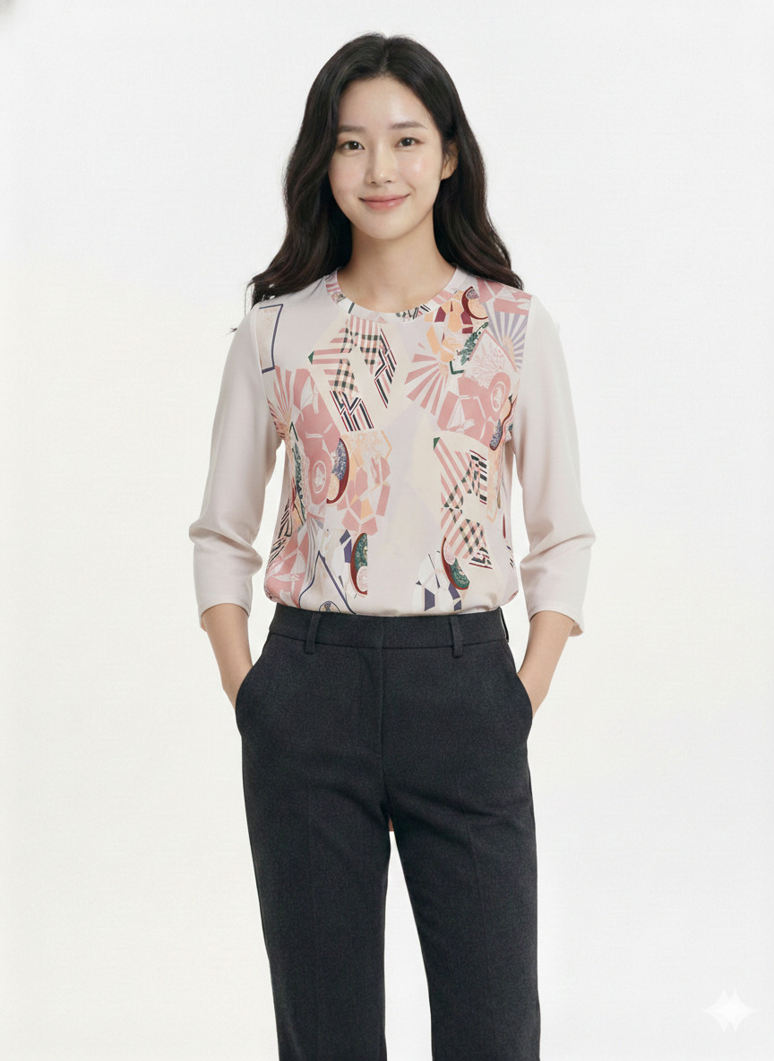 [크로커다일레이디] 베이지 라운드 기하학 프린트 소매 블라우스 CLCMTS129