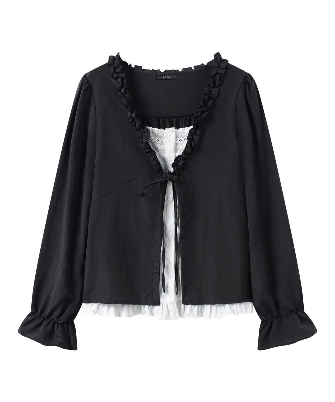 프릴 넥 레이어드 배색 긴팔 블라우스 (GQABA020D)