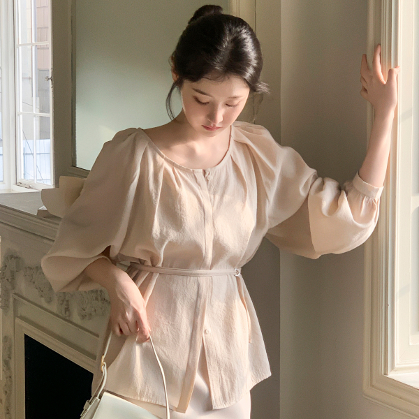 [프롬리리컬] (MADE/프리미엄모달/벨트set) 리에르 벌룬 소매 셔링 벨트 블라우스 bs8592