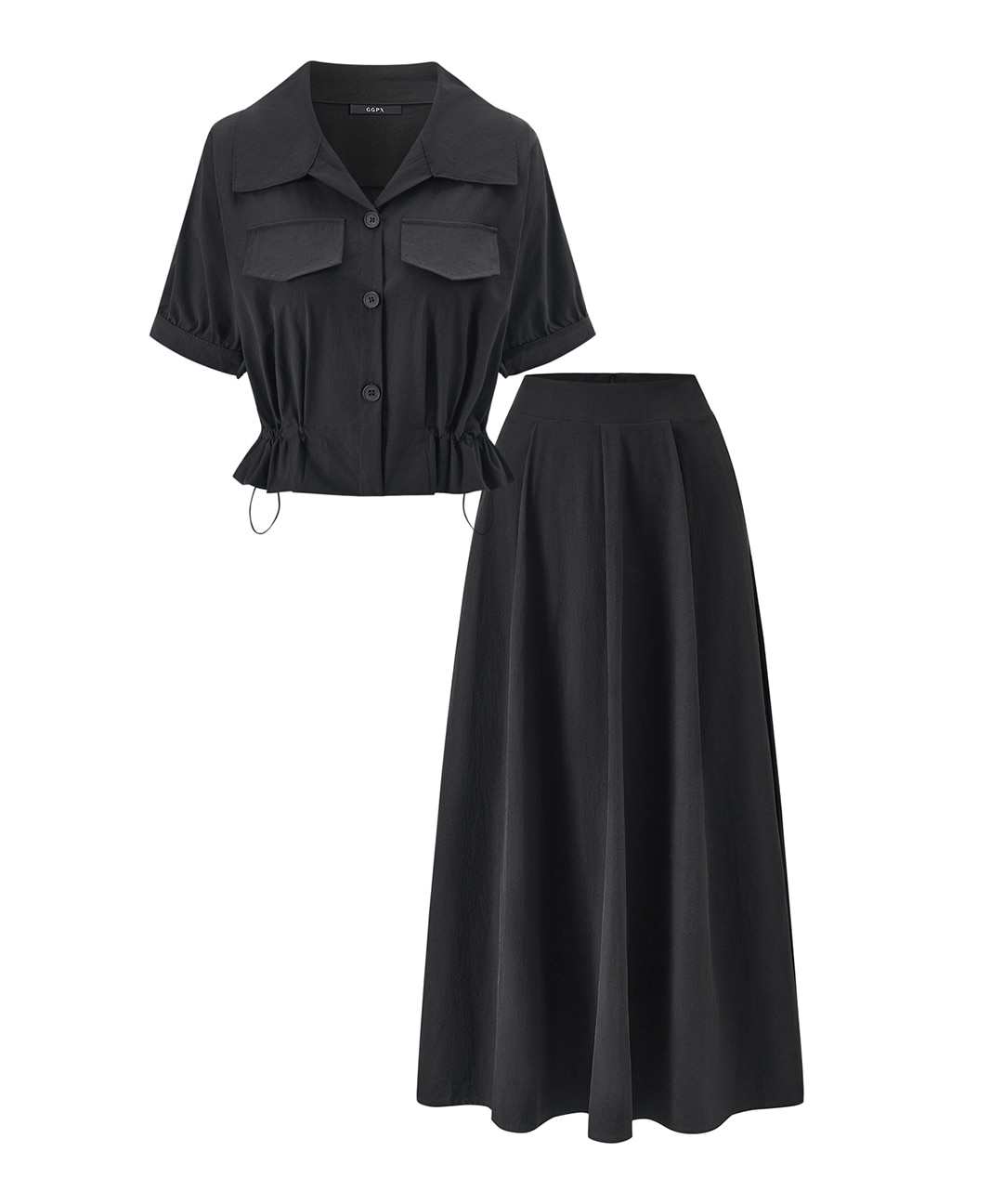 [신상추천] 데일리 오픈카라 스트링 반팔 셔츠 롱 스커트 셋업 (GQBOW011D)