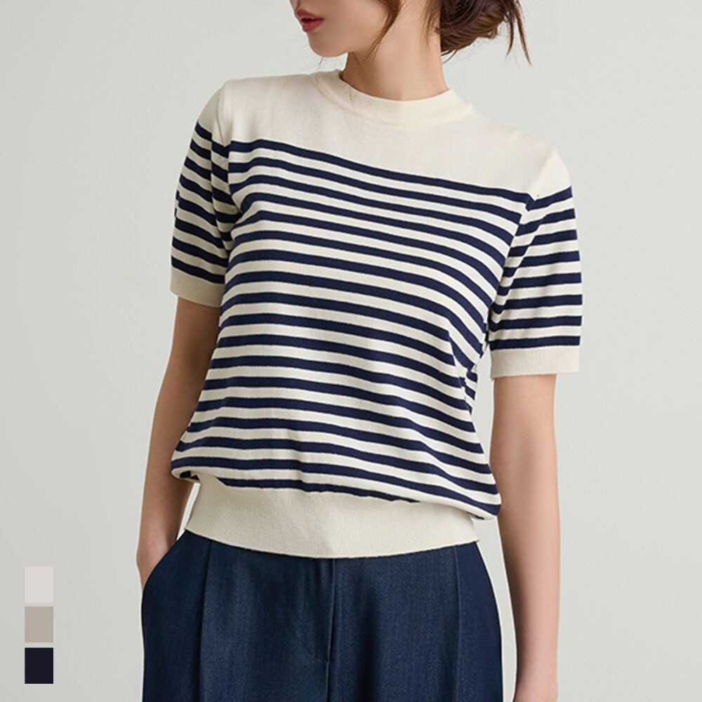 스트라이프 라운드넥 반팔 기본핏 니트 (SJK26003)