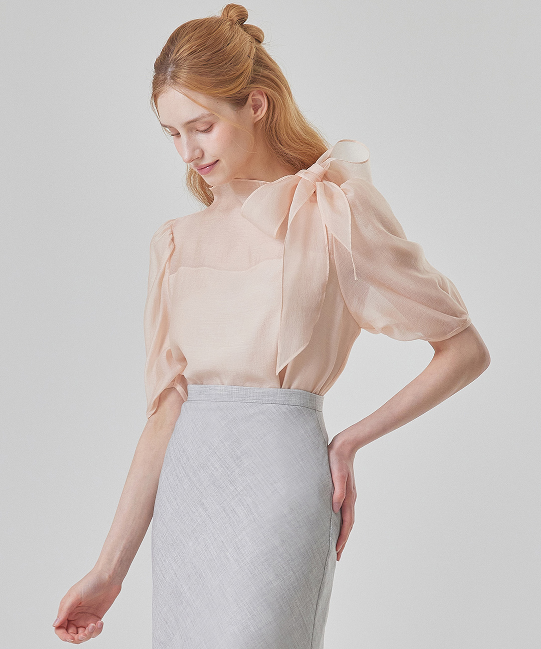 리본넥 이중 시어 블라우스_M6M1BL5450