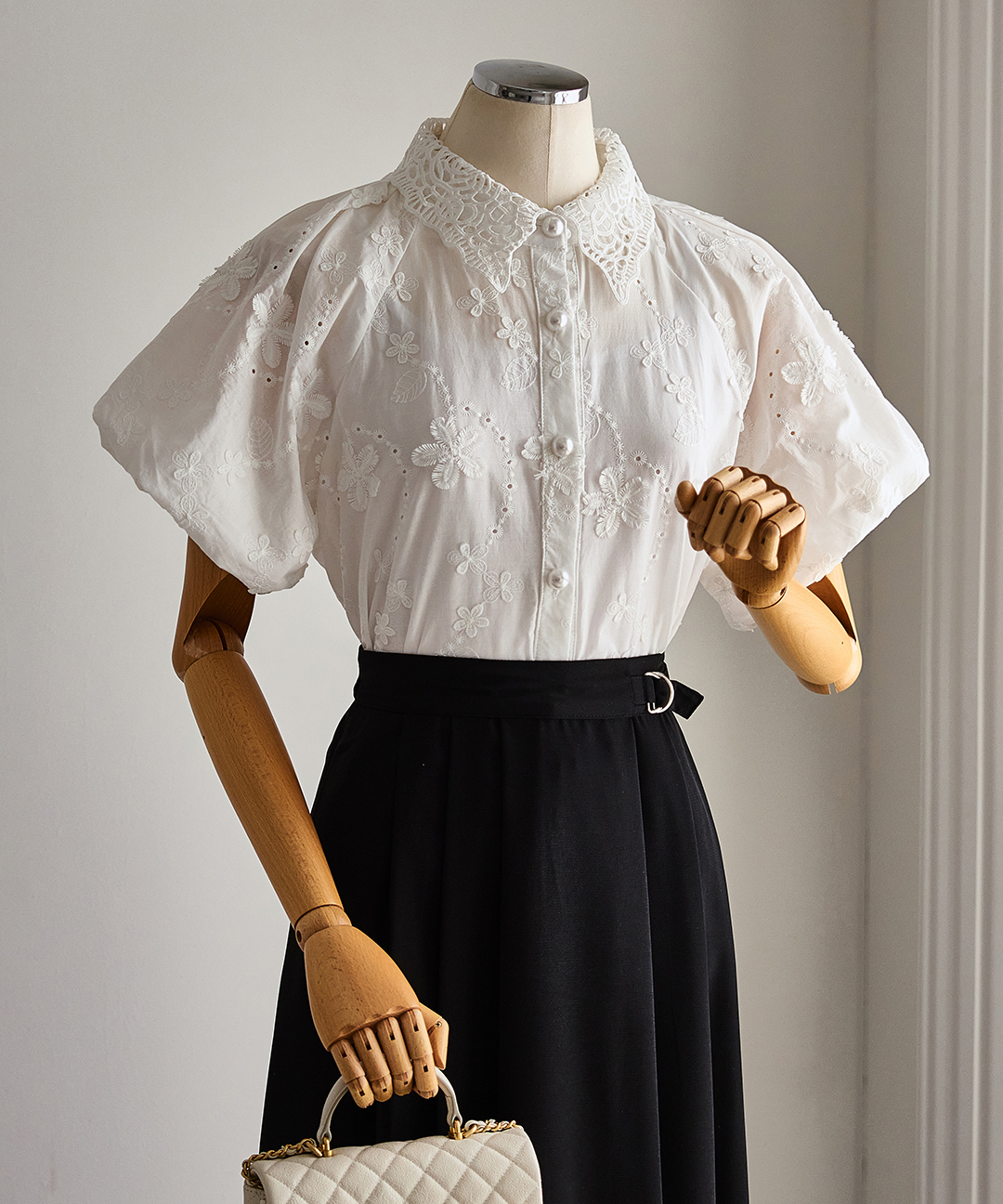 [커스텀에이블] 레이스 카라 자수 퍼프 블라우스_T2604BL060B