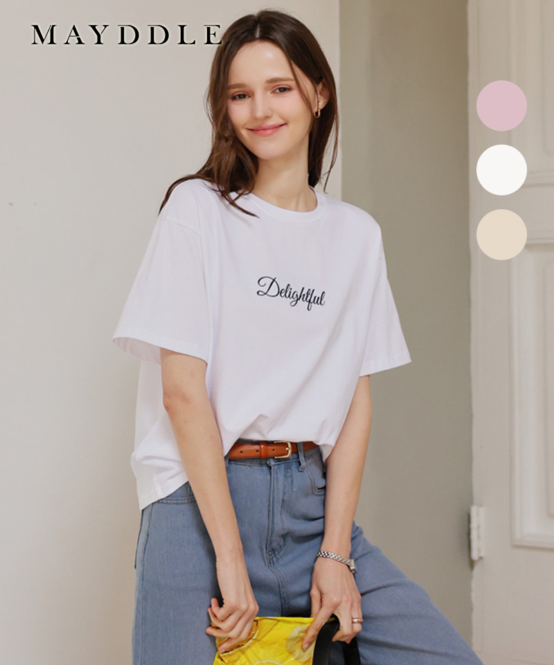 [면100]딜라잇자수 반팔티 / 영어레터링반팔티 이너 레이어드반팔티셔츠 라운드넥반소매티셔츠 크림 핑크 화이트 봄옷 봄상의 봄반팔 딸선물 패밀리티셔츠 단체반팔티 야유회 나들이 여행룩